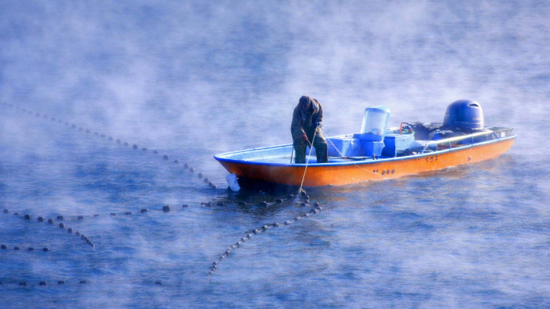 6일 아침 강원 인제군 소양호 일원에 한파로 인해 물안개가 피어난 가운데 한 어부가 조업하고 있다. 인제군 제공