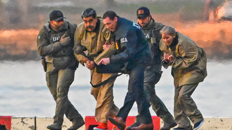 체포된 니콜라스 마두로 베네수엘라 대통령과 그의 아내 실리아 플로레스가 2026년 1월 5일 미국 뉴욕에서 기소를 위해 연방법원으로 이송되는 동안 월스트리트 헬기장에 도착하고 있습니다. EPA 연합