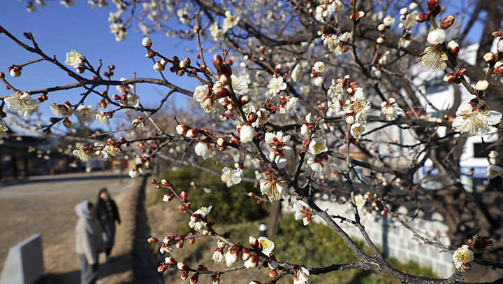 6일 강원 강릉시 용강동의 한 매화나무에 봄꽃 매화가 활짝 펴 눈길을 끌고 있다. 연합