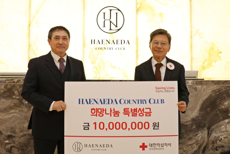 해내다컨트리클럽이 7일 대한적십자사 대구지사에 ‘2026년 적십자 특별성금’ 1000만 원을 기탁했다.이번 성금은 각종 재난 발생 시 이재민 지원과 지역사회 취약계층을 돕는 적십자 인도주의 사업에 사용될 예정이다.해내다컨트리클럽은 2021년 적십자 특별성금 기부를 시작으로 ESG 실천기업 가입을 통한 정기후원 등 꾸준한 나눔 활동을 이어오고 있다.