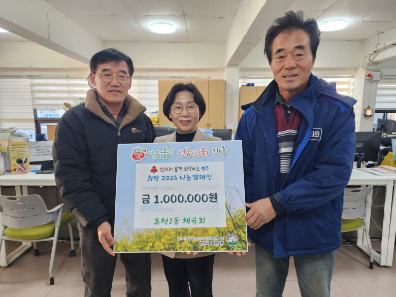 영주시 휴천1동 체육회(회장 정광호)는 지난 5일, 관내 어려운 이웃을 돕기 위한 성금 100만 원을 휴천1동 행정복지센터에 전달하며 ‘희망2026나눔캠페인’에 동참했다.이번 성금은 우리 주변의 어려운 이웃에게 실질적인 도움을 전하고 함께 살아가는 공동체 의식을 실천하기 위해 체육회 회원들의 자발적인 참여와 따뜻한 마음을 모아 마련됐다.정광호 휴천1동 체육회장은 “작은 정성이지만 우리 주변의 어려운 이웃들이 따뜻한 새해를 보내는 데 도움이 되길 바란다”며, “앞으로도 체육회 활동뿐만 아니라 지역사회를 위한 나눔과 봉사에도 앞장서겠다”고 말했다.김금주 휴천1동장은 “지역 체육 활성화는 물론, 매년 잊지 않고 이웃사랑을 실천해주시는 체육회 회원들께 깊은 감사를 드린다”며, 기탁해주신 성금은 경북사회복지공동모금회를 통해 도움이 꼭 필요한 이웃들에게 잘 전달하겠다”고 전했다.한편, 휴천1동 체육회는 매년 지역 행사를 지원하고 이웃돕기 성금을 기탁하는 등 지역 공동체 발전을 위해 꾸준히 활동하며 귀감이 되고 있다.