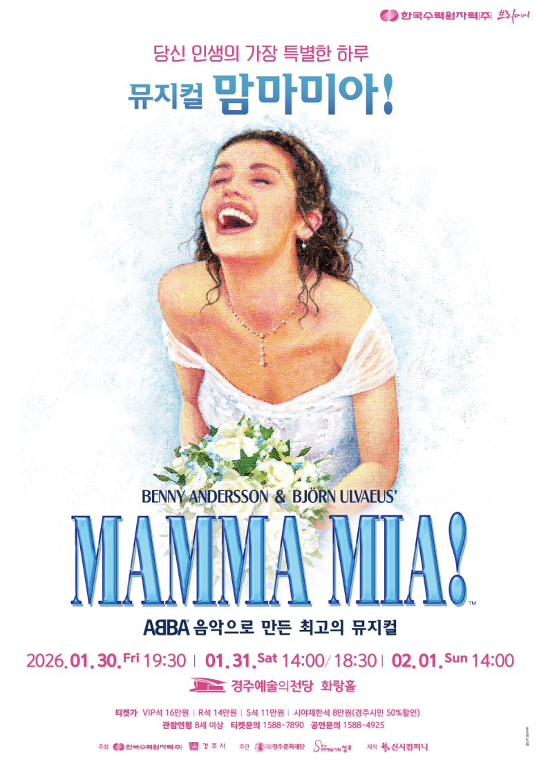 한국수력원자력(주)과 경주시가 주최하고 (재)경주문화재단이 주관하는 한국수력원자력 프리미어 기획공연으로 뮤지컬 '맘마미아!'가 오는 30일부터 2월 1일까지 경주예술의전당에서 경주시민들과 만난다.