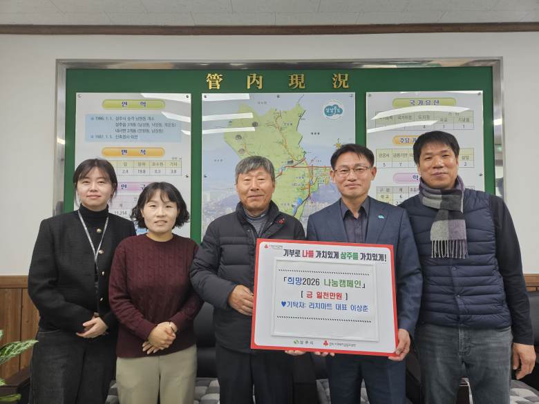 상주시 남원동의 ㈜리치마트에서 '희망2026 나눔캠페인' 기간을 맞아 소외된 이웃들을 위해 성금 1000만 원을 기탁했다. 올해로 창업 27주년을 맞이한 리치마트는 지역 대표 마트라는 명성에 걸맞게 매년 꾸준한 나눔 활동을 펼치며 '노블레스 오블리주'를 실천해오고 있다. 이상춘 대표는 "리치마트의 시작점인 1호점이 위치한 남원동은 고향과도 같은 곳"이라며 "추운 겨울을 보내고 있을 이웃들에게 작은 정성이 힘이 되길 바란다. 앞으로도 지역사회와 함께 성장하는 기업이 되겠다"고 했다. 고두환 남원동장은 "모두가 어려운 시기에 큰 결정을 내려준 이상춘 대표께 깊이 감사드린다"며 "기탁된 성금은 복지 사각지대에 놓인 가구에 소중히 전달해 온기 넘치는 남원동을 만들겠다"고 했다.