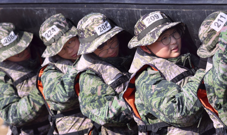 13일 경북 포항시 해병대 1사단에서 열린 해병대 겨울 캠프에서 참가자들이 훈련을 하고 있다. 연합