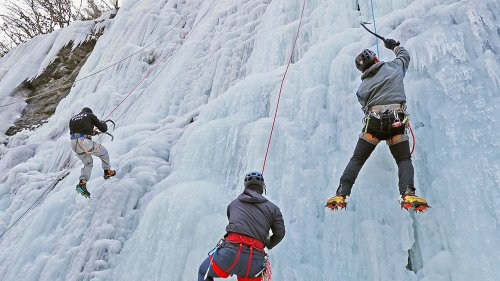 15일 경북 의성군 의성구계빙장에서 전문 산악인들이 빙벽등반을 하고 있다. 연합