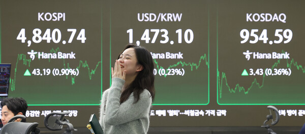 코스피가 사상 처음으로 4800선을 돌파하며 꿈의 지수인 '오천피'까지 바짝 다가섰다. 외국인과 기관의 매수세에 힘입어 11거래일 연속 사상 최고치 행진을 이어갔다.16일 한국거래소에 따르면 코스피는 전 거래일(4797.55)보다 43.19포인트(0.90%) 상승한 4840.74에 마감했다.코스피는 이날 0.48% 오른 4820.66에 출발해 장초 가파른 상승세를 이어갔다. 오전 4850선 인근에서 횡보하던 지수는 오후 12시40분께 4855.61을 기록하며 사상 최고치를 갈아치웠다.코스피가 4800선을 돌파한 것은 사상 처음이다. 지수는 새해 들어 11거래일 연속 상승 랠리를 펼치고 있다. 지난 9일 4500 후반대를 기록했던 지수는 이틀에 걸쳐 100포인트씩 상승하며 고점을 높이고 있다.지수 상승에 따라 코스피 시가총액도 사상 처음으로 4000조원을 넘어섰다. 이날 장마감 후 집계된 코스피 시가총액은 4002조1499억원으로 집계됐다. 지난해 10월 15일 3000조 돌파 이후 세달여만이다.외국인과 기관의 매수세가 지수 상승을 견인했다. 유가증권시장에서 이날 외국인과 기관은 각각 4062억원, 3388억원을 순매수했다. 개인은 홀로 9381억원을 순매도했다.업종별로는 비철금속(6.99%), 전자제품(4.44%), 보험(3.29%), 기계(3.05%), 반도치(2.31%) 등이 상승한 반면, 철강(-4.29%), 자동차(-1.63%), 에너지(-1.40%), 조선(-1.18%) 등은 낙폭이 컸다.시가총액 상위 종목은 혼조세로 마감했다.삼성전자는 전장 대비 3.47% 오른 14만8900원에, SK하이닉스는 0.93% 오른 75만6000원에 장을 마쳤다. 삼성전자는 장중 14만9500원까지 오르며 52주 신고가를 또다시 경신했다.이밖에 한화에어로스페이스(0.39%), 두산에너빌리티(6.48%), SK스퀘어(3.96%) 등은 올랐고, LG에너지솔루션(-0.26%), 삼성바이오로직스(-0.92%), 현대차(-2.13%), HD현대중공업(-1.43%), 기아(-0.92%) 등은 하락했다.코스닥 지수는 전 거래일(951.16)보다 3.43포인트(0.36%) 오른 954.59에 거래를 마쳤다.시총 상위 종목에서는 알테오젠과 삼천당제약이 각각 10.10% 오른 51만8000원, 10.06% 오른 27만9000원에 장을 마감하며 두드러진 상승세를 보였다.이밖에 에이비엘바이오(2.545), 코오롱티슈진(3.46%), 리가켐바이오(2.33%), 펩트론(0.65%)이 상승한 반면, 에코프로비엠(-3.19%), 에코프로(-2.22%), 레인보우로보틱스(-5.01%), HLB(-1.31%)는 하락했다.