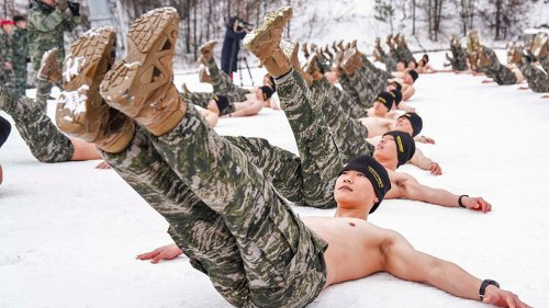 지난 15일 해병대 특수수색여단 장병들이 강원 평창군 황병산 일대에서 열린 2026년 동계 설한지 훈련에서 내한 극복을 위한 체력 단련을 실시하고 있다. 해병대사령부 제공