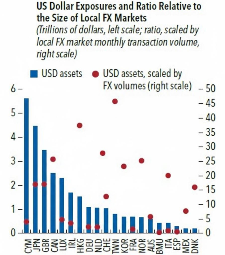 환리스크에 노출된 우리나라의 달러자산 규모가 외환시장에 비해 과도한 수준이라고 국제기관이 경고했다. 최근 원/달러 환율 상승압력을 키우는 구조적 배경으로 작용하는 동시에, 글로벌 금융시장의 불확실성 국면에서 환율 변동성에 취약할 수 있다는 지적이다.18일 국제통화기금(IMF)의 '글로벌 금융안정보고서'(Global Financial Stability Report)를 보면, 우리나라는 외환시장 규모에 비해 달러자산 환노출 비중이 상당히 큰 국가로 분류됐다. IMF가 지난해 10월 발간한 보고서에서 제시한 '외환시장 규모(월간 거래량) 대비 환노출 달러자산' 지표에서다. 이 지표는 각국 외환시장이 환율 변동 충격을 얼마나 흡수할 수 있는지를 가늠하는 구조적 척도로 활용된다.보고서에 따르면 우리나라는 환노출 달러자산이 외환시장 거래량의 25배 안팎에 달하는 것으로 나타났다. 주요국(홍콩·케이만제도 제외) 중에서 캐나다(CAN)와 노르웨이(NOR) 등과 비슷한 수준이다. 노르웨이도 국부펀드를 중심으로 해외투자가 많은 국가로 꼽힌다. 외환시장 대비 환노출 달러자산 배율이 가장 높은 국가는 대만(TWN)으로, 대략 45배에 달했다. 대만의 달러자산 규모는 우리나라와 엇비슷하지만, 외환시장 규모가 작다보니 배율이 상대적으로 높았다.절대적인 자산 규모만 놓고 보면 일본(JPN)이 가장 크지만, 일본은 외환시장 규모 역시 커 배율은 20배를 밑도는 것으로 분석됐다. 독일과 프랑스, 이탈리아, 스페인, 네덜란드, 오스트리아 등 유럽 주요국들은 외환시장 대비 환노출 달러자산 비중이 한 자릿수 배율에 그쳤다.유럽 주요국이나 캐나다·일본은 준기축통화 경제권이라는 점에서 사실상 한국과 대만에 경각심을 요구하는 지표로도 볼 수 있다. 외환시장 대비 환노출 달러자산 배율이 높은 비기축통화국은, 달러가치 변동에 따른 충격을 외환시장에서 단기간에 흡수하기 어렵다는 점에서다. IMF는 "일부 국가는 달러자산 환노출이 외환시장의 깊이에 비해 불균형적으로 크다"고 지적했다.IMF는 특히 환노출 상태에 있는 글로벌 투자자들이 한꺼번에 환헤지에 나서는 이른바 '환헤지 쏠림'(rush to hedge) 가능성에도 주목했다. 달러 선물환 매도가 동시에 발생할 경우, 달러 환노출 배율이 큰 외환시장을 중심으로 변동성이 증폭할 수 있다는 것이다. 최근 국민연금이 '전략적 환헤지'를 본격화한 것도 이런 환율 변동 리스크를 사전에 관리하려는 취지로 해석할 수 있다.반면 대체로 환노출 상태로 해외주식 투자에 나서는 일명 '서학개미'들에 대해서는 개인의 자산운용뿐만 아니라 거시경제 차원에서도 위험관리 필요성이 함께 제기된다. 이와 관련, 재경경제부는 지난해 말 발표한 '국내투자·외환안정 세제지원 방안'에서 주요 증권사들을 통해 '개인투자자용 선물환 매도 상품'을 출시하겠다고 밝혔다.개인이 특정 환율에 선물환을 매도하면, 이를 사들인 은행은 달러 매도매입 포지션을 맞추기 위해 달러 현물을 시장에 팔아야 한다. 개인으로서는 환리스크를 관리하는 동시에 외환시장에는 달러 공급이 늘어나는 효과가 예상된다.