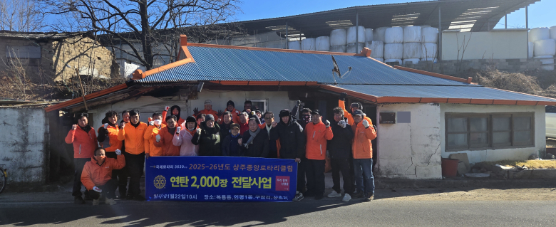 상주시 동성동에서는 지난 22일, 상주중앙로타리클럽 회원 30여 명과 함께, 관내 동절기 난방취약계층 독거노인 가구에 방문해 연탄 500장을 지원하고 배달 봉사를 했다. 상주중앙로타리클럽은 지역사회의 소외된 계층에게 나눔과 봉사활동 및 주거개선 사업 등 다양한 분야에서 지역 사랑을 실천하고 있다. 장수진 상주중앙로타리클럽 회장은“회원들의 작은 정성이 담긴 사랑의 연탄이 지역사회 어려운 이웃들에게 따뜻하고 건강한 겨울을 지내시는데 도움이 되기를 바란다”고 했다. 이하국 동성동장은 “추운 날씨에도 관내 난방취약계층 어르신에게 따뜻한 온기를 전해주신 상주중앙로타리클럽 회원 여러분께 감사드린다”며 “동성동 사각지대의 취약계층들이 안전하고 따뜻한 겨울을 보낼 수 있도록 더욱 세심히 살피겠다”라고 했다