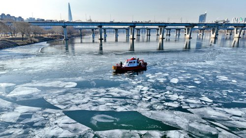 한파가 이어지는 23일 서울 한강 광나루 관공선 선착장 인근에서 119 광나루수난구조대가 순찰 근무를 하며 출동로 확보 작업을 하고 있다. 연합