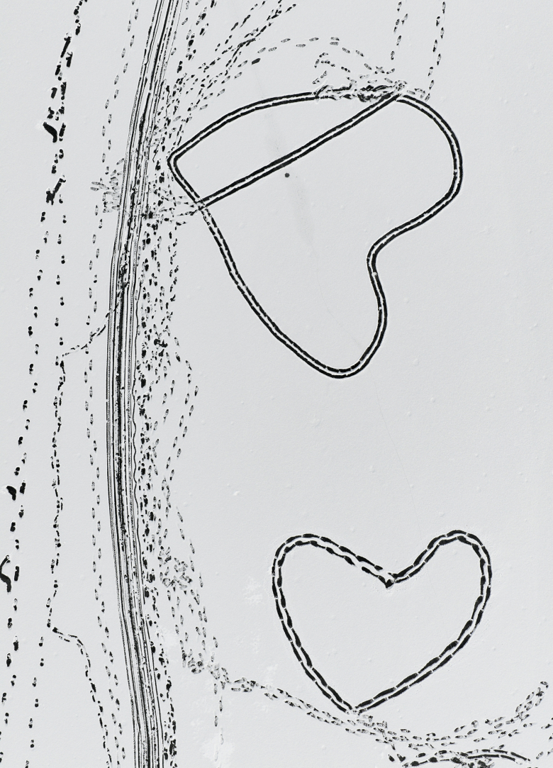 한파가 이어지고 있는 26일 경기도 화성시 저수지 눈밭 위에 하트가 그려져 있다. 연합