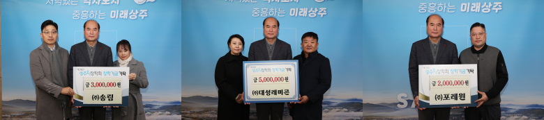㈜송림(대표 송경덕)과 ㈜대성레미콘(대표 최규성), ㈜포레원(대표 김기문)은 26일 상주시의 미래를 이끌어 갈 인재 육성을 위해 써달라며 상주시장학회에 장학금을 기탁했다.㈜송림 300만 원, (주)대성레미콘 500만 원, ㈜포레원은 200만 원을 전달해 총 1000만 원을 기탁했다.기탁자들은 모두 삼백로타리 회원으로 활동하고 있으며, ㈜대성레미콘 최규성 대표는 삼백로타리 6대 회장, ㈜송림 송경덕 대표는 4대 회장을 역임했다. ㈜포레원 김기문 대표는 현재 환경위원장으로 활동 중이다. 또한 이번 기탁에는 삼백로타리 부인회인 ‘삼백 The 여원’(회장 이정희)도 함께 참여해 의미를 더했다.강영석 상주시장은 “어려운 시기에도 상주시장학회에 장학금을 기탁해 주신 데 대해 진심으로 감사드린다”며 “지역의 미래를 이끌어 갈 인재 육성을 위해 다자녀 장학금과 희망 장학금 확대 등 지역 교육 발전에 최선을 다하겠다”고 말했다.