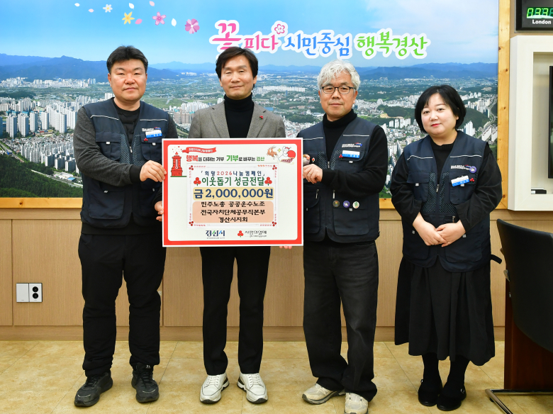 민주노총 공공운수노조 전국자치단체공무직본부 경산시지회(지회장 전성진)는 지난 26일 경산시청을 방문해 지역 내 어려운 이웃을 돕고자 이웃돕기 성금 200만원을 기탁했다.전성진 지회장은“현장에서 함께 일하는 회원들의 마음을 모아 성금을 준비했다”며 “우리 주변의 이웃들이 조금이나마 따뜻한 겨울을 보내는 데 보탬이 되기를 바란다”고 전했다.조현일 경산시장은“이웃을 생각하는 마음으로 성금을 기탁해 주신 민주노총 공공운수노조 전국자치단체공무직본부 경산시지회에 감사드린다”며“기탁된 성금은 경북사회복지공동모금회를 통해 도움이 필요한 이웃에게 소중히 전달하겠다”고 말했다.