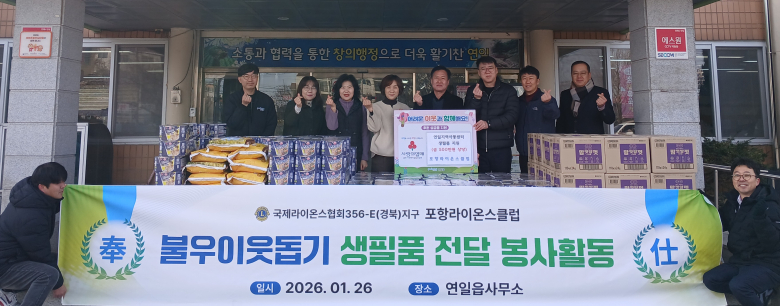 포항라이온스클럽(회장 최원철)이 설 명절을 맞아 지역사회에 따뜻한 나눔을 실천했다.포항라이온스클럽은 지난 26일 연일읍행정복지센터에서 지역아동센터 6개소를 대상으로 500만 원 상당의 후원 물품을 전달하는 행사를 열고, 지역 아동들과 주민들에게 설 명절의 온정을 전했다.최원철 포항라이온스클럽 회장은 “설날은 가족과 함께 따뜻한 정을 나누는 소중한 명절”이라며 “이번 후원은 라이온스클럽 회원들이 민족 최대의 명절인 설을 맞아 지역 아동들에게 작은 기쁨과 희망을 전하고자 마련한 선물”이라고 밝혔다.신대섭 연일읍장은 “매년 명절마다 잊지 않고 사랑을 전해주시는 포항라이온스클럽 회원들께 깊이 감사드린다”며 “전달받은 물품은 관내 지역아동센터 아동들에게 잘 전달해 소외되는 이웃이 없는 따뜻한 설 명절이 될 수 있도록 하겠다”고 말했다.한편, 포항라이온스클럽은 저소득층 주거환경 개선 사업을 비롯해 환경정비, 물품 후원, 이웃돕기 성금 전달 등 다양한 봉사활동을 통해 지역사회 나눔 문화 확산에 앞장서고 있다.