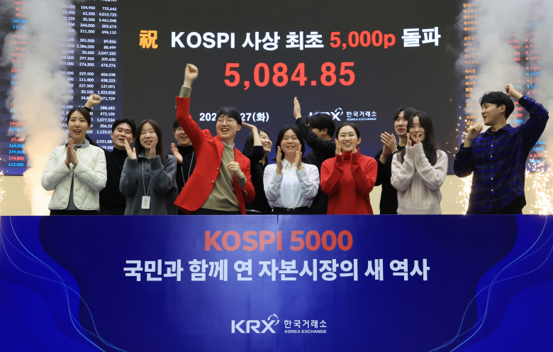 한국산 제품에 대한 관세를 무역합의 이전으로 되돌리겠다는 도널드 트럼프 미국 대통령의 압박에도 코스피가 27일 3% 가까이 급등하며 종가 기준으로 처음 '오천피'를 넘어섰다.이날 코스피는 전장보다 135.26포인트(2.73%) 오른 5,084.85로 장을 마감했다. 종가 기준으로 코스피가 5,000선을 넘어선 건 이번이 처음이다. 코스피는 이날 장중 고가에 거래를 마쳐 종가 기준 사상 최고치와 전날 기록한 장중 사상 최고기록(5,023.76)을 동시에 갈아치웠다. 지수는 16.70포인트(0.34%) 내린 4,932.89로 개장한 이후 한때 4,890.72까지 밀렸으나, 빠르게 낙폭을 회복한 뒤 상승폭을 키우는 흐름을 보였다.이날 오후 3시 30분 기준 서울 외환시장에서 달러 대비 원화 환율은 5.6원 오른 1,446.2원을 나타냈다.유가증권시장에서는 외국인과 기관이 각각 8513억원과 2327억원을 순매수했고, 개인은 1조199억원을 순매도했다. 장 초반에는 개인이, 중후반에는 기관과 외국인이 번갈아 가며 주도적으로 순매수에 나서며 시장을 끌어올렸다. 외국인은 코스피200선물시장에서도 4292억원 매수 우위를 기록했다. 개인과 기관은 792억원과 3556억원 매도 우위였다.간밤 뉴욕증시는 주요 빅테크 기업의 실적 발표를 앞두고 기대감이 유입되면서 3대 지수가 일제히 올랐다. 다우존스30 산업평균지수가 0.64% 상승했으며, 스탠더드앤드푸어스(S&P)500지수와 나스닥종합지수도 각각 0.50%, 0.43% 올랐다. 그러나 트럼프 대통령이 이날 사회관계망서비스(SNS) 트루스소셜에 올린 글에서 한국산 제품에 대한 관세를 무역 합의 이전 수준으로 다시 인상하겠다고 밝혀 국내 증시의 타격이 불가피해 보였다.그런 분위기 속에서 출발한 국내 증시에서 삼성전자는 개장 직후 1.91% 내린 14만9200원까지 밀렸으나, 최종적으로는 4.87% 급등한 15만9500원으로 장을 마쳤다. SK하이닉스도 0.41% 내려 73만3000원까지 하락했다가 반등해 8.70% 오른 80만원으로 거래를 종료, 52주 신고가를 경신했다.