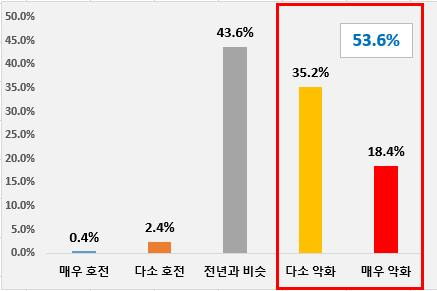 '악화했다'는 기업 중 업종별로는 건설업이 53.8%로 가장 많고, 제조업(47.4%), 유통·서비스업(44.5%) 순이다.체감경기 악화 요인(복수응답)은 '내수 경기 부진'이 74.4%로 가장 많았고 이어 '관련 산업 위축 및 수요 감소'(37.6%), '원·부자재 가격 변동'(30.1%), '환율 변동성 확대'(19.5%), '인건비 부담 증가'(18.8%)' 순이다.