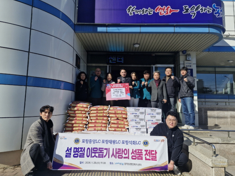 포항중앙·태왕·석화 라이온스클럽이 설 명절을 앞두고 지역 내 취약계층을 위한 나눔 활동에 나섰다.포항중앙라이온스클럽(회장 권순일), 태왕라이온스클럽(회장 심재권), 석화라이온스클럽(회장 고애진)은 28일 양학동 행정복지센터를 방문해 백미 10kg 50포와 라면(20개입) 33상자, 각티슈 등 총 250만 원 상당의 후원 물품을 전달했다.이번 후원은 명절을 앞두고 경제적 어려움을 겪는 이웃들에게 실질적인 도움을 주기 위해 마련됐다. 참여 클럽 관계자들은 “작은 정성이지만 따뜻한 명절을 보내는 데 보탬이 되길 바란다”며 “앞으로도 지역사회와 함께하는 나눔 활동을 지속적으로 펼쳐 나가겠다”고 밝혔다.이금화 양학동장은 “설 명절을 앞두고 지역 이웃을 위한 따뜻한 나눔을 실천해 주셔서 감사드린다”며 “기탁된 물품은 취약계층 가정에 소중히 전달하겠다”고 말했다.