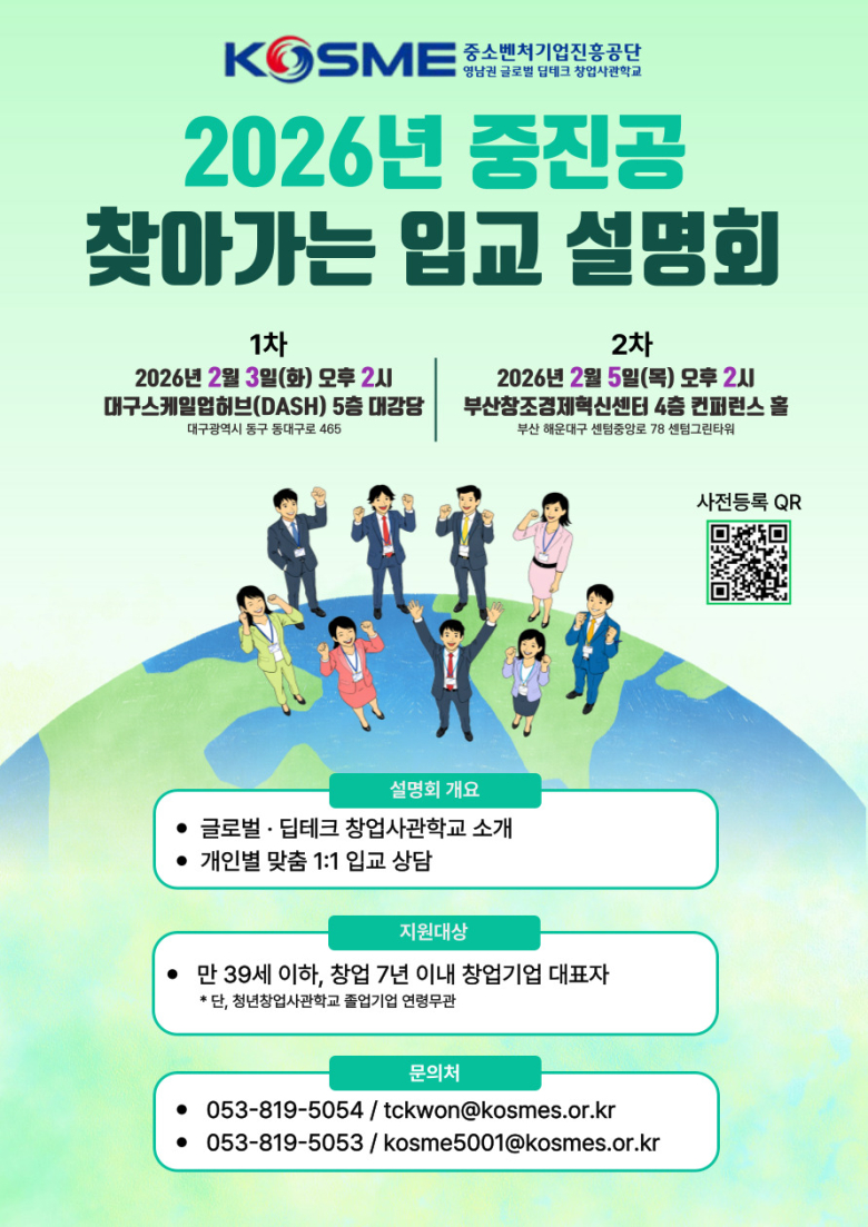 중소벤처기업진흥공단 경북청년창업사관학교는 영남권 유망 스타트업의 글로벌 도약과 딥테크 성장을 지원하기 위해 ‘2026년 창업성공패키지 영남권 글로벌·딥테크 과정‘ 설명회를 이달 3일과 5일 양일간 대구와 부산에서 개최 예정이다. 이번 과정은 글로벌 20명, 딥테크 35명 등 총 55명 규모로 모집하며 글로벌 진출을 준비하는 스타트업과 AI, 바이오헬스, 친환경에너지 등 딥테크 분야 창업기업이 대상이다. 선발된 기업에는 최대 2억원의 사업화 자금과 함께 글로벌 현지 진출 프로그램, 딥테크 기술사업화 지원 등 고성장 기업육성을 위한 단계별 맞춤형 프로그램이 제공된다. 경북청년창업사관학교는 입교 희망자들의 이해를 돕기 위해 3일 대구스케일업허브 5층을 시작으로, 5일 부산창조경제혁신센터 4층 컨퍼런스홀에서 설명회를 진행한다. 설명회에서는 청년창업사관학교 소개, 2026년 글로벌·딥테크 심화과정 지원사업 안내, 입교 희망기업 대상 상담이 순차적으로 이뤄진다. 영남권 글로벌·딥테크 과정 신청자격은 만 39세 이하 청년으로 창업 7년이내 기업의 대표자다. 접수는 1월 30일 K-Startup 누리집(www.k-startup.go.kr)을 통해 온라인으로 신청할 수 있으며 접수마감은 2월 13일까지다. 서류평가와 발표평가를 거쳐 3월 중 최종 선정 기업을 공고할 예정이다. 경북청년창업사관학교 서성규 원장은 “글로벌 진출과 딥테크 기술의 사업화를 추진하는 청년창업자들에게 실질적인 도약의 발판이 되기를 발판이 되기를 희망한다”며 “혁신적인 아이템을 보유한 청년창업가들의 많은 도전을 바란다”고 밝혔다.자세한 사업 내용 및 입교 문의는 중소벤처기업진흥공단 경북청년창업사관학교(053-819-5054~5058)로 하면 된다.