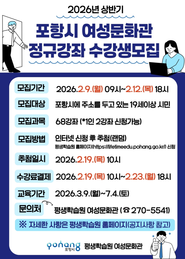 포항시 평생학습원 여성문화관은 ‘2026년 상반기 정규강좌’ 수강생을 모집한다. 이번 교육은 시민 강의 만족도 조사 결과를 반영해 직장인을 위한 야간·주말 강좌를 확대 운영하고, 실버산업 성장 추세에 발맞춰 고령자의 삶을 지원하는 실버 관련 자격증 과정을 새롭게 신설하는 등 수요자 중심의 변화가 눈에 띈다. 수강 신청은 오는 6일 수강료 면제자를 대상으로 한 우선 모집을 시작으로, 2월 9일부터 12일까지 포항시 평생학습원 홈페이지(http://lifetimeedu.pohang.go.kr)를 통해 온라인으로 진행된다. 우선 모집은 정원의 10% 이내에서 선착순으로 접수하며, 교육 기간은 2026년 3월 9일부터 7월 4일까지 총 16주간 운영된다. 이번 상반기 정규강좌는 기술자격증 과정부터 문화·예술, 인문학 등 총 68개 강좌로 구성되며, 모집 인원은 1,353명이다. 수강생은 추첨을 통해 선발되며, 1인당 최대 2과목까지 신청할 수 있다. 신규 개설 강좌로는 ▲실버케어지도사 ▲실버인지놀이지도사 2급 ▲동화구연지도사 3급 ▲영화로 만나는 심리학 ▲AI 예술로 힐링하기 ▲셔플댄스 ▲알수록 돈 되는 생활 재테크 등 총 13개 과정이 마련됐다. 이와 함께 기술자격증, 직업능력, 문화·예술·건강, 정보화 분야의 기존 인기 강좌도 지속 운영돼 시민들에게 폭넓은 학습 기회를 제공할 예정이다. 조현미 평생학습원장은 “언제, 어디서나, 누구나 배움의 기회를 누릴 수 있는 평생학습도시 포항을 만들기 위해 시대 변화에 맞춘 다양한 맞춤형 강좌를 준비했다”며 “시민들의 적극적인 관심과 참여를 바란다”고 말했다. 한편 강좌 관련 자세한 사항은 포항시 평생학습원 홈페이지 공지사항을 참고하거나 여성문화관(☎054-270-5541)으로 문의하면 된다.