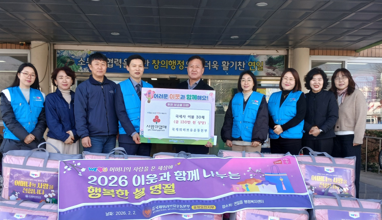 (사)국제위러브유운동본부 오천지부가 설 명절을 맞아 연일읍 지역 이웃들을 위한 나눔 활동을 펼쳤다.국제위러브유운동본부 오천지부는 2일 연일읍행정복지센터를 방문해 취약계층을 위한 극세사 이불 30채를 기탁했다. 이번 기탁은 설 명절을 맞아 어려운 이웃들이 따뜻한 명절을 보낼 수 있도록 돕기 위해 마련됐다.조봉래 오천지부장은 “온정이 담긴 선물이 어려운 이웃들에게 잘 전달돼 모두가 행복한 설 명절을 보내는 데 도움이 되길 바란다”고 말했다.신대섭 연일읍장은 “매년 명절마다 이웃사랑 나눔을 실천해 주는 국제위러브유운동본부에 감사드린다”며 “읍민 모두가 따뜻하고 행복한 연일을 만드는 데 최선을 다하겠다”고 밝혔다.