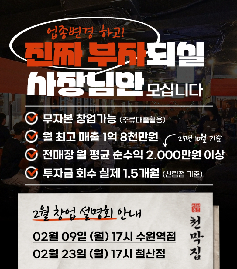 한식 기반의 가성비 좋은 메뉴와 포장마차 컨셉을 전개하는 술집 창업 브랜드 청불천막집포차가 예비창업자를 대상으로 창업 자금 부담을 확 낮춘 창업설명회를 2월 9일과 23일에 개최한다고 전했다.본 창업설명회에서는 총 340여 개의 술집 창업 컨설팅 이력을 가진 창업전문가가 청불천막집포차의 억대 매출 달성 노하우, 브랜드 대표 메뉴 시식, 창업 자금 마련 방안 등의 다양한 창업 정보를 제공할 예정이며, 모든 컨설팅은 1:1 전담 컨설팅으로 진행된다.청불천막집포차는 초저녁엔 추억의 분위기와 안주로 식사와 음주를 함께 선보이는 실내 포장마차로, 유동인구가 적은 심야 시간에는 헌팅포차로 전환하는 이중 판매 전략과 고물가 시대에 1차부터 4차까지 모두 가능한 다양한 메뉴를 합리적인 가격에 만나볼 수 있는 가격 경쟁력을 통해 영업시간 내내 꾸준하게 소비자를 확보하고 있다.여기에 술집은 살아남기 힘들다는 평택역 2층 매장에서 시작해 오픈 이후 2년 내내 월평균 매출1억 2천만원 돌파함과 동시에 운영 중인 직영점 5곳의 투자금을 평균 3개월 만에 회수하는데 성공하며 수익성과 지속성 모두 갖춘 아이템으로 창업자들 사이에서 이목이 집중되고 있다.청불천막집포차 관계자는 “최근 경기 불황으로 창업 자금 마련에 도움이 필요한 창업자들에게 실질적인 솔루션을 제공하는 자리가 될 것”이라며 “앞으로도 창업을 준비하는 예비 창업자들에 더욱 유익한 정보를 제공하는 설명회를 개최하기 위해 노력하겠다”고 전했다.한편, 이러한 우수성을 인정받아 지난 ‘2025 대한민국 NO.1 프랜차이즈 대상’에서 주점 부문 대상을 수상하는 등의 영예를 안은 청불천막집포차 창업설명회 참가 신청은 홈페이지 및 대표번호를 통해 확인할 수 있다.