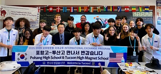포항고등학교가 미국 애리조나주 투산교육청과 협력해 투산 마그넷 고등학교와 상호방문형 국제교류를 실시하며 교육과정 연계형 글로벌 교육 모델을 선보였다.포항고는 지난 1월 9일부터 23일까지 12박 15일간 학생 9명을 미국 투산으로 파견해 현지 고교 정규 수업에 직접 참여하는 국제교류 프로그램을 운영했다고 밝혔다. 참가 학생들은 1학년 8명, 2학년 1명으로, 여름방학 중 선발돼 약 5개월간 원어민 강사를 활용한 어학 연수와 미국 문화 이해 수업을 사전에 이수했다.이번 교류는 단순한 해외 문화 체험을 넘어 교육과정 연계와 공동 학습을 핵심으로 기획됐다. 학생들은 홈스테이를 하며 투산 마그넷 고등학교의 과학·예술 중심 수업에 참여했고, 실습과 토론 위주의 학생 주도 학습 문화를 직접 경험했다.특히 포항고 학생들은 교류의 수동적 참여자가 아닌 주체로 나섰다. 한국 학교생활과 문화를 주제로 프레젠테이션을 진행하고, 자개 키링 만들기와 전통 갓 체험 등 체험형 프로그램을 직접 기획·운영해 현지 학생과 교직원, 홈스테이 가족들로부터 호응을 얻었다.양 학교는 이번 교류를 계기로 온라인 공동 학습과 지속적인 상시 교류 가능성에 대해 공감대를 형성하며 장기적인 국제교육 협력 기반도 마련했다. 투산교육청 관계자는 포항고 학생들의 준비된 태도와 문화 이해도에 깊은 인상을 받았다고 평가했다.이와 함께 학생들은 애리조나 대학교 캠퍼스 투어, 지역 문화 행사 참여, 스포츠 경기 관람 등 다양한 현지 체험 활동에 참여했으며, 일정 중 로스앤젤레스를 방문해 그리피스 천문대와 UCLA 캠퍼스를 견학하며 미국 대학의 학문 환경도 체험했다.포항고 관계자는 “이번 국제교류는 학생들이 세계를 직접 경험하며 학습과 진로의 시야를 넓히는 계기가 됐다”며 “앞으로도 학생 중심의 실질적인 국제교류 프로그램을 지속적으로 확대할 계획”이라고 밝혔다.