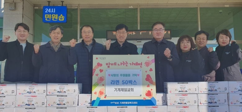 설 명절을 앞두고 포항 북구 기계면에서 변함없는 이웃사랑이 올해도 이어졌다.포항시 북구 기계면에 위치한 기계제일교회(담임목사 김익영)는 지난 3일 기계면행정복지센터를 방문해 설 명절 소외된 이웃을 위해 사용해 달라며 라면 50상자를 전달했다.기계제일교회는 매년 설과 추석 등 명절마다 빠짐없이 생필품을 기탁하며 지역 내 취약계층을 위한 나눔을 실천해 오고 있다. 이러한 정기적인 기부 활동은 단발성 지원을 넘어 지역 공동체의 신뢰를 쌓고, 복지 사각지대 해소에 기여하고 있다는 평가를 받고 있다.김익영 담임목사는 “명절이 되면 더욱 외로움을 느끼는 이웃들이 많다”며 “작은 정성이지만 지역사회가 함께하고 있다는 마음이 잘 전해지길 바란다”고 말했다. 이어 “앞으로도 명절마다 이웃과 온정을 나누는 교회의 역할을 이어가겠다”고 덧붙였다.최정훈 기계면장은 “해마다 명절이면 잊지 않고 따뜻한 나눔을 실천해 주시는 기계제일교회에 감사드린다”며 “기탁된 물품은 관내 독거노인과 저소득 가구 등 도움이 필요한 이웃들에게 정성껏 전달하겠다”고 밝혔다.