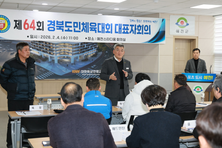 예천군은 4일 오전 11시 예천군스타디움 1층 회의실에서 제64회 경북도민체육대회 출전을 위한 종목단체 대표자회의를 개최하고 대회 전반에 대한 주요 일정과 운영 사항을 공유했다.제64회 경북도민체육대회는 4월 3일부터 6일까지 4일간 예천군과 안동시 일원에서 개최하는 대회로 경상북도와 경상북도체육회가 주최하고 예천군과 안동시, 예천군체육회와 안동시체육회가 공동 주관한다.또한 개회식은 경북도청 새마을광장, 폐회식은 예천진호국제양궁장 결승경기장에서 열릴 예정이다.예천군은 이번 대회에 군부 정식 15개 종목(골프, 궁도, 농구, 배구, 배드민턴, 볼링, 족구, 소프트테니스, 씨름, 육상, 축구, 탁구, 태권도, 테니스, 레슬링)에 임원진과 선수단을 포함한 400여 명의 선수단을 출전시킬 계획이며 종목별 경기장은 예천군과 안동시 일원에 분산 배치된다.이날 회의에서는 경기 일정, 의료시설, 지정병원 운영 등 대회 전반에 대한 설명과 종목단체별 협조 사항, 예산 집행기준 및 카드사용원칙, 정산 절차 등 행정 지원 사항에 대한 안내도 함께 진행됐다.김학동 군수는 “이번 대표자회의는 종목단체와의 사전 소통을 통해 보다 체계적이고 효율적인 추진 기반을 마련하기 위한 자리”라며 “남은 기간 동안 체계적인 준비와 긴밀한 협조를 통해 선수들이 최상의 경기력을 발휘할 수 있도록 지원을 아끼지 않겠다”고 말했다.