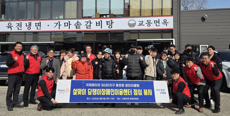 국제로타리 3630지구 동포항 로타리클럽(회장 박진현)은 5일 포항시 연일읍에 위치한 담쟁이장애인이용센터를 방문해 설 명절을 맞아 점심 봉사활동을 펼쳤다.이번 봉사활동은 명절을 앞두고 지역 장애인들에게 따뜻한 식사를 제공하고 정을 나누기 위해 마련됐으며, 동포항 로타리클럽 회원들이 직접 참여해 음식 준비와 배식 봉사에 구슬땀을 흘렸다.이날 회원들은 센터 이용자들과 인사를 나누며 식사를 돕는 한편, 명절을 앞둔 안부를 전하며 따뜻한 교류의 시간을 가졌다. 담쟁이장애인이용센터 관계자는 “회원들의 정성 어린 봉사로 이용자들이 더욱 풍성하고 따뜻한 명절을 맞이할 수 있게 됐다”며 감사의 뜻을 전했다.동포항 로타리클럽은 지역 내 취약계층을 위한 급식 봉사와 물품 지원 등 다양한 사회공헌 활동을 꾸준히 이어오고 있으며, 앞으로도 소외된 이웃을 위한 나눔과 봉사활동을 지속적으로 전개할 계획이다.