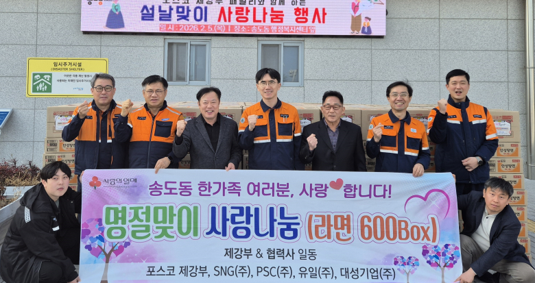 포스코 제강부와 협력사인 PR테크, PSC(주), SNC(주), 유일(주), 대성기업(주), 화인텍(주)은 설 명절을 앞둔 5일 포항시 남구 송도동 행정복지센터(동장 심순섭)에 라면 600상자를 기탁했다. 포스코 제강부는 명절마다 후원 물품을 전달하며 지역사회 공헌과 나눔 문화 확산에 앞장서고 있다. 이번 기탁 행사에는 송도동 개발자문위원장(이세욱)이 참석하여 의미를 더했다. 협력사들이 공동으로 조성한 기금으로 마련된 물품은 송도동 관내 저소득층 및 취약계층 주민들에게 지원될 예정이다. 윤정균 포스코 제강부장은 “작은 정성이지만 주민들께서 설 명절을 맞아 따뜻한 마음을 나누고 즐거운 시간을 보내시기를 바란다”며 “앞으로도 지역사회와 함께하는 나눔 활동을 이어가겠다”고 밝혔다. 심순섭 송도동장은 “경제적으로 어려운 시기에 포스코 제강부와 협력사들이 보여준 실천적 나눔은 큰 힘이 된다”며 “기탁된 물품은 도움이 필요한 이웃들에게 잘 전달하겠다”고 전했다.