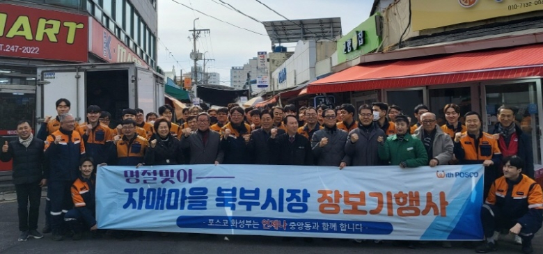 포스코 화성부와 포항시 북구 중앙동이 설 명절을 앞두고 전통시장을 찾아 장보기 행사를 열며 지역경제 활성화에 힘을 보탰다.포항시 북구 중앙동 자매부서인 포스코 화성부는 6일 영일대북부시장에서 설맞이 전통시장 장보기 행사를 진행했다. 이날 행사에는 포스코 화성부 직원과 중앙동 자생단체 회원 등 70여 명이 참여했다.이번 행사는 명절을 앞두고 침체된 전통시장에 활력을 불어넣고 지역 상인들과 상생하기 위해 마련됐다. 참가자들은 시장을 돌며 제수용품과 생필품 등을 직접 구매하며 상인들과 소통하는 시간을 가졌다.시장 상인들은 “명절마다 잊지 않고 찾아와 주는 것이 큰 힘이 된다”며 감사의 뜻을 전했다. 장보기 행사로 오랜만에 시장에 활기가 돌면서 상인들의 표정에도 웃음이 번졌다.정연학 중앙동장은 “설 명절을 앞두고 전통시장을 찾아 따뜻한 마음을 나눠주신 포스코 화성부에 감사드린다”며 “기업과 지역사회가 함께 성장하는 좋은 사례로, 중앙동도 상생의 가교 역할을 이어가겠다”고 말했다.박진국 포스코 화성부 부장은 “지역 상인들에게 작은 도움이 될 수 있어 뜻깊다”며 “앞으로도 중앙동과의 인연을 소중히 이어가며 지역사회와 함께하는 활동을 지속하겠다”고 밝혔다.