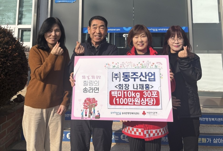 포항 지역 기업 동주산업이 설 명절을 앞두고 지역 취약계층을 위한 나눔 활동에 나섰다.포항 동주산업은 5일 송라면행정복지센터를 방문해 지역 내 취약계층을 돕기 위해 100만 원 상당의 백미 10㎏ 30포를 기탁했다.동주산업은 매년 설과 추석 등 명절마다 지역 주민을 위한 쌀 기부를 이어오고 있으며, 평소에도 소외된 이웃을 위한 후원 활동을 지속해 오고 있다.나채홍 동주산업 회장은 “명절을 맞아 이웃들이 조금이나마 따뜻하게 보내길 바라는 마음으로 쌀을 준비했다”며 “앞으로도 나눔과 선행을 꾸준히 실천하겠다”고 말했다.김남경 송라면장은 “매년 잊지 않고 이웃사랑을 실천해 주는 동주산업에 감사드린다”며 “기탁된 쌀은 관내 취약계층에게 소중히 전달하고, 촘촘한 복지 안전망 구축에 힘쓰겠다”고 밝혔다.