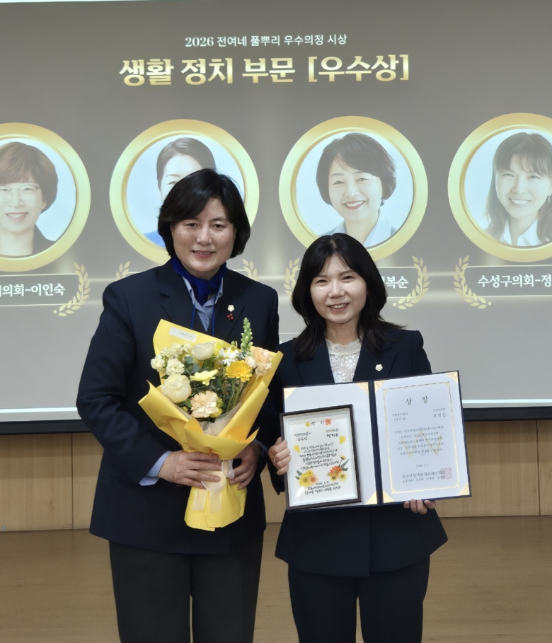 대구 수성구의회 정경은 의원(더불어민주당)이 전국 여성 지방의원들의 우수 의정활동을 평가하는 공모에서 생활정치 분야 우수상을 수상했다.정 의원은 지난 5일 국회의사당 제3세미나실에서 열린 ‘2026 전국여성지방의원네트워크 풀뿌리 우수의정사례 공모’ 시상식에서 생활정치 분야 우수상 수상자로 선정됐다. 이번 행사는 전국여성지방의원네트워크가 주최하고 (사)지방자치발전소가 주관했다.‘전여네 풀뿌리 우수의정사례 공모’는 여성 지방의원의 우수한 의정 성과를 발굴·확산하고 여성의 정치 참여 확대를 도모하기 위한 행사로, 이번 공모에서는 정성 평가와 정량 평가를 합산해 전국에서 총 55명의 수상자가 선정됐다.정 의원은 수성구의회 제9대 전반기 사회복지위원회와 후반기 도시환경보건위원회에서 활동하며 기후위기 대응, 지역 공동체 활성화, 안전한 지역사회 조성을 주요 의정 과제로 삼아 왔다.특히 '수성구 음식물류 폐기물 감량기기 설치 및 지원 조례' 제정을 통해 연간 100세대에 음식물 쓰레기 감량기기 보급 근거를 마련했으며, '수성구 1회용품 줄이기 활성화 지원 조례'를 통해 제로웨이스트샵 인증제 도입과 다회용기 사용 촉진 등 생활 속 탄소중립 실천을 제도화한 점이 높은 평가를 받았다.이와 함께 의원연구단체 활동과 토론회, 간담회 등을 통해 주민 의견을 적극 수렴하고 이를 정책과 의정활동에 반영하는 현장 중심 의정활동을 지속해 왔다.정 의원은 “이웃과 자연, 생명을 살피는 생활정치를 목표로 의정활동을 해왔다”며 “앞으로도 기후위기 대응과 주민 참여를 바탕으로 누구도 소외되지 않는 공동체를 만들어 가는 데 힘쓰겠다”고 말했다.