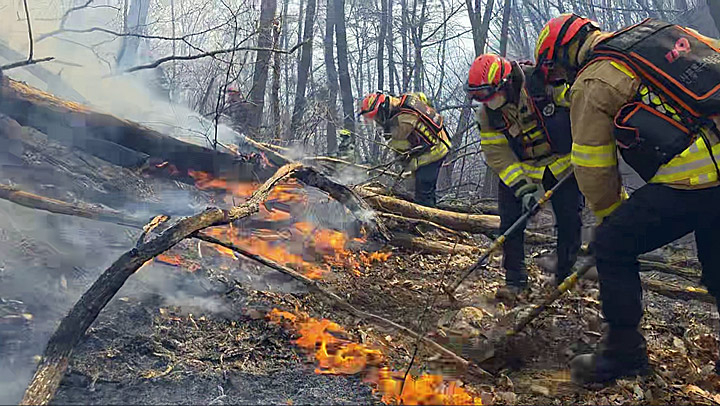 8일 경북 경주시 문무대왕면 입천리에서 소방대원들이 전날부터 이어진 산불을 진화하고 있다. 경북소방본부 제공