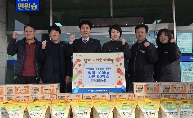 설 명절을 앞두고 지역 농협의 이웃돕기 나눔이 이어지고 있다.서포항농협은 지난 5일 포항시 북구 기계면 행정복지센터를 방문해 친환경 우렁이쌀 100㎏과 라면 60상자(약 150만 원 상당)를 기탁했다.이번에 전달된 물품은 기계면 내 저소득 가구와 홀몸 어르신 등 취약계층에 전달될 예정이다.서포항농협은 매년 설과 추석 명절마다 지역 내 소외된 이웃을 위한 물품 기탁을 이어오며 지역사회 나눔 활동을 지속하고 있다.김주락 서포항농협 조합장은 “작은 정성이지만 어려운 이웃들이 명절을 보내는 데 도움이 되길 바란다”고 말했다.최정훈 기계면장은 “매년 꾸준히 나눔을 실천해 주는 서포항농협에 감사드린다”며 “기탁된 물품은 꼭 필요한 가구에 전달하겠다”고 밝혔다.