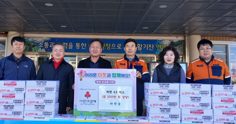 ㈜한중(공동대표이사 강제호·오태식)이 설 명절을 앞두고 지역 취약계층을 위한 나눔을 실천했다.㈜한중은 9일 포항시 연일읍행정복지센터를 방문해 100만 원 상당의 라면 62상자를 설맞이 이웃돕기 물품으로 기탁했다. 전달된 물품은 연일읍 관내 취약계층 가구에 배부될 예정이다.강제호·오태식 공동대표이사는 “임직원 모두가 설 명절을 맞아 어려운 이웃들이 소외되지 않고 따뜻한 시간을 보내길 바라는 마음으로 후원 물품을 준비했다”며 “기업의 성장과 발전은 지역 주민과 함께할 때 더욱 의미가 있다고 생각한다”고 말했다.신대섭 연일읍장은 “매번 연일읍의 어려운 이웃들에게 관심을 갖고 나눔을 실천해 주시는 ㈜한중에 깊이 감사드린다”며 “기탁해 주신 물품은 취지에 맞게 도움이 필요한 분들께 잘 전달하겠다”고 밝혔다.한편 ㈜한중은 매년 설과 추석 명절마다 취약계층을 위한 물품 기탁을 이어오며, 지역사회와 상생하는 기업으로서의 사회적 책임을 꾸준히 실천하고 있다.