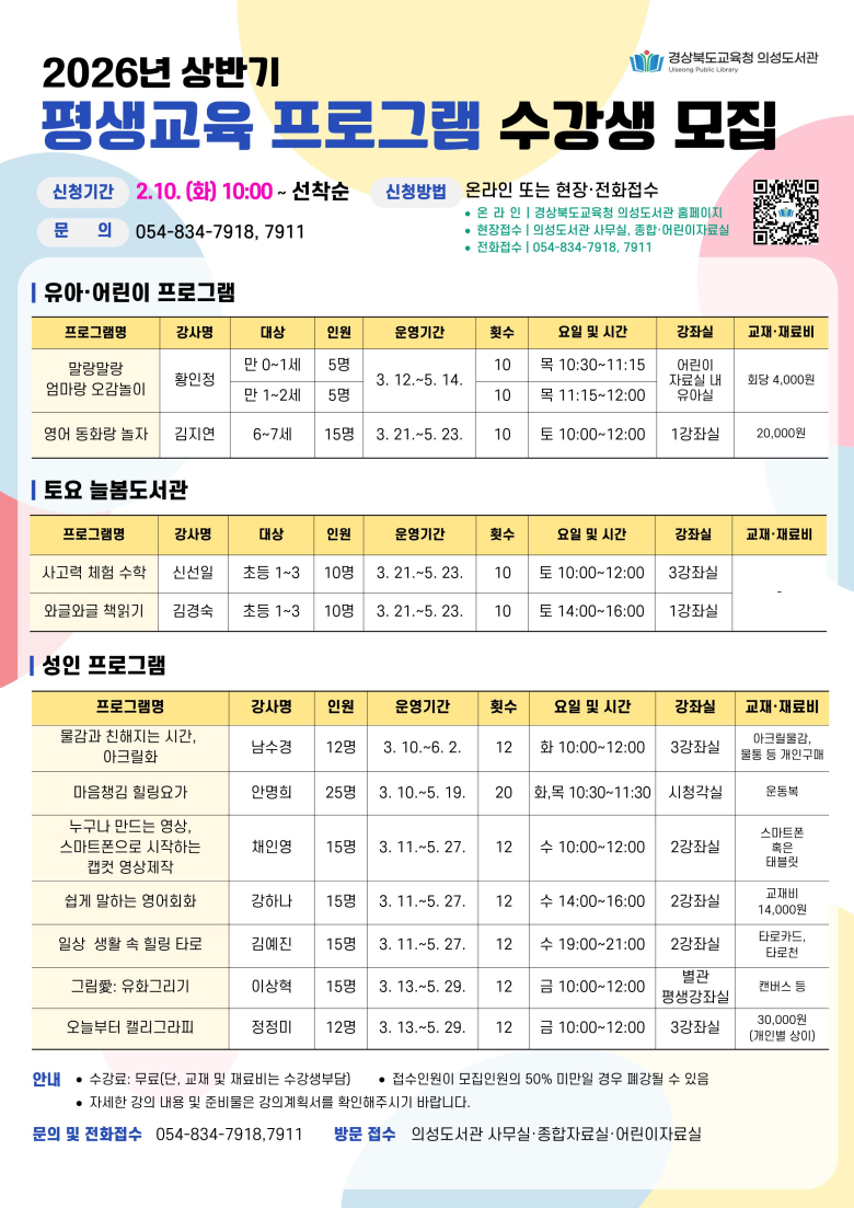 경상북도교육청 의성도서관은 지역주민의 평생학습 기회를 확대하고 삶의 질 향상을 도모하기 위해 오는 10일부터 상반기 평생교육 프로그램 수강생을 모집한다고 밝혔다. 상반기 평생교육 프로그램은 3월 10일부터 6월 2일까지 운영되며 유아·어린이 대상 프로그램, 토요 늘봄도서관, 성인 프로그램 등 총 11개 과정으로 구성됐다. 특히 유아·어린이를 위한 프로그램 운영을 통해 보호자와 아이가 함께 도서관을 이용할 수 있는 기회를 제공하고 토요 늘봄도서관 프로그램으로 돌봄 공백을 최소화함으로써 가정의 사교육비 부담 완화에 도움을 줄 것으로 기대된다.
