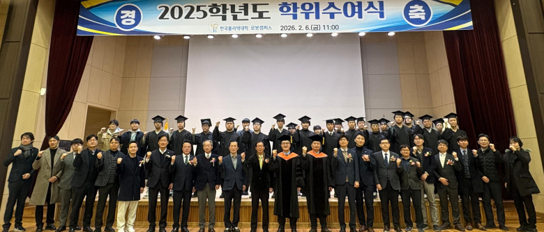 한국폴리텍대학 로봇캠퍼스는 지난 6일 대학 본관 대강당에서 ‘2025학년도 제4회 학위수여식’을 개최하고 미래 로봇 산업을 이끌어갈 졸업생 64명을 배출했다고 밝혔다.  행사는 국민의례를 시작으로 학사보고, 학위증서 수여, 시상식, 축사 순으로 경건하게 진행됐다. 학위증서 수여식에서는 로봇IT과 최준 학생이 졸업생 대표로 산업학사 학위증서를 수여받았으며 학사모 수술을 옮기는 의식을 통해 정식 공학도로서 인정받는 뜻깊은 순간을 연출했다.  이어진 시상식에서는 재학 기간 중 우수한 학업 성취와 성실한 태도로 타의 모범이 된 졸업생들에 대한 표창 수여가 진행됐다. 특히 이번 수여식에는 로봇캠퍼스 1기 졸업생인 이재호 동문회장이 참석해 후배들을 위해 ‘동문회장 장학금’을 직접 기탁해 훈훈함을 더했다.