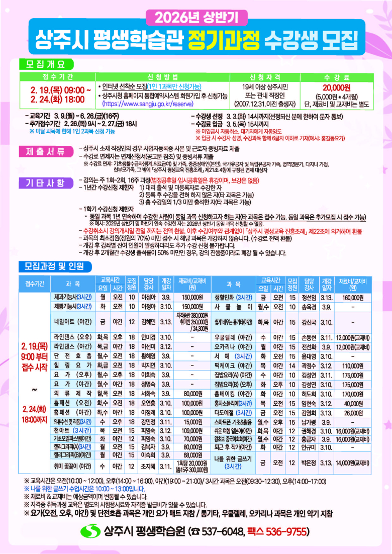 상주시 평생학습원은 ‘2026년 상반기 평생학습관 정기과정 수강생’을 모집한다. 이번 상반기 정기과정은 시민들의 교육 수요를 반영해 35개 강좌로 구성됐으며 모집 인원은 503명이다. 교육과정은 ▲네일아트 외 직업능력 강좌 ▲라인댄스 외 문화예술 강좌 ▲집밥요리 외 인문교양 강좌 등 시민들의 실생활에 도움이 되는 다채로운 프로그램으로 운영할 예정이다. 수강 신청은 2월 19일부터 2월 24일까지 상주시청 홈페이지 통합예약시스템(https://www.sangju.go.kr/ reserve)을 통해 인터넷 선착순으로 진행된다.상주시에 주소를 둔 시민이나 상주 소재 직장인이라면 누구나 신청할 수 있으며 수강료 2만원과 재료비 및 교재비는 수강생 본인 부담이다. 상주시 평생학습원은 매년 상·하반기 정기과정을 통해 시민들의 질 높은 교육 서비스를 제공하며 평생학습 문화 확산에 앞장서고 있으며 특히 이번 과정은 트렌드를 반영한 신규 강좌를 보강해 학습자들의 만족도를 높일 것으로 기대된다. 상주시 평생학습원 관계자는 “시민들이 일상속에서 배움의 즐거움을 느끼고 개인의 역량을 강화할 수 있도록 알찬 프로그램을 준비했다” 며 “선착순으로 모집이 진행되는 만큼 관심 있는 시민들의 빠른 신청을 바란다”고 했다. 기타 자세한 사항은 상주시 평생학습원 홈페이지 공지사항을 참고하거나 평생교육팀(054-537-6048)으로 문의하면 된다.