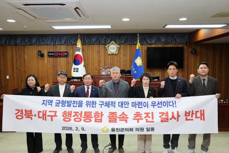 울진군의회는 지난 9일 '경북·대구 행정통합 졸속 추진'을 반대하는 성명을 발표하며 경북도지사의 공개 사과를 요구했다.
