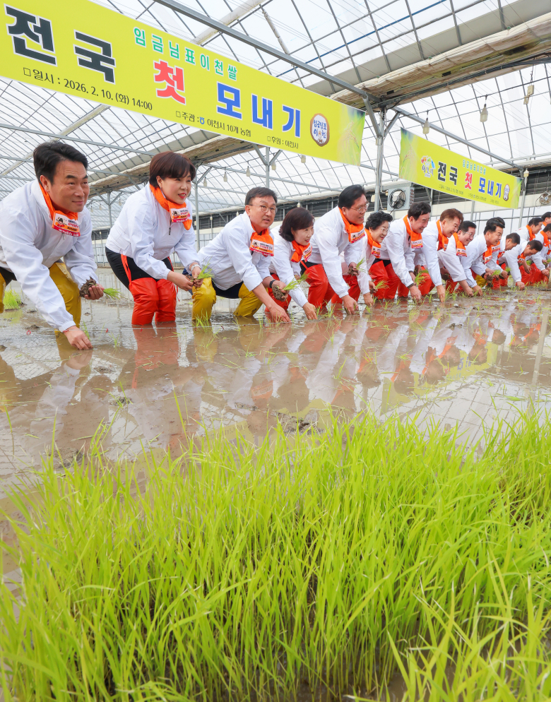 10일 경기 이천시 호법면 안평리 비닐하우스 논에서 열린 '임금님표 이천 쌀 첫 모내기 행사'에서 참석자들이 모를 심고 있다. 연합