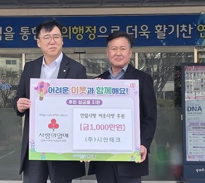 ㈜시안테크(대표 최원철)가 11일 포항시 남구 연일읍행정복지센터에 ‘연일사랑 이웃사랑’ 후원금 1000만 원을 기탁했다.시안테크는 수배전반과 전동기 제어반, 자동제어반 등을 전문 제작·납품하는 기업으로, 그동안 백미와 라면, 생필품 기부 등 지역사회 나눔 활동을 이어왔다.최원철 대표는 “지역의 어려운 이웃을 위한 나눔을 실천할 수 있어 뜻깊다”며 “앞으로도 지속적으로 이웃사랑을 실천하겠다”고 말했다.신대섭 연일읍장은 “매년 지역을 위한 나눔에 감사드린다”며 “후원금이 저소득층을 위한 다양한 지원 사업에 소중히 사용될 수 있도록 하겠다”고 밝혔다.‘연일사랑 이웃사랑’ 후원금은 지역 내 저소득층을 대상으로 학용품과 책상·의자 지원, 백미 전달, 주거환경 개선 등 사업에 활용되고 있다.