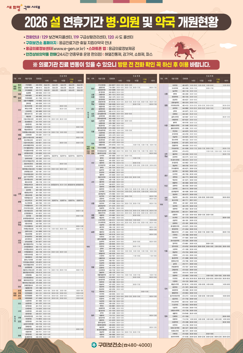 구미시는 설 연휴 기간인 14일부터 18일까지 5일간 의료 공백을 막고 시민 불편을 최소화하기 위해 응급실 비상진료체계를 강화한다.연휴 동안 응급환자 대응 역량을 유지하면서 당직 병·의원과 휴일지킴이 약국을 지정 운영해 지역 의료 안전망 공백을 줄여 평일과 같이 불편을 최소화한다.이를 위해 지역 응급의료기관인 구미차병원, 순천향구미병원, 구미강동병원 3곳을 24시간 운영해 중증 응급환자에 즉각 대응한다. 이와 함께 127개 당직 병·의원과 165개 휴일지킴이 약국을 가동해 연휴 기간에도 진료와 의약품 이용에 불편이 없도록 할 방침이다.특히 순천향구미병원 '365 소아청소년 진료센터'는 연휴 동안 24시간 소아청소년과 전문의가 상주해 응급진료를 제공한다. 구미차병원 '구미+신생아 집중치료센터'는 고위험 신생아 입원 치료와 24시간 응급분만이 가능해 출산·신생아 의료 공백을 최소화한다.달빛어린이병원(옥계연합·형곡연합·구미연합)은 설 당일인 17일을 제외한 연휴 기간 소아 경증환자 외래 진료를 운영해 보호자의 부담을 덜어준다.연휴 기간 문여는 의료기관과 약국 정보는 구급상황관리센터(119), 보건복지부 콜센터(129), 응급의료포털(www.e-gen.or.kr), 구미시청·보건소 홈페이지에서 확인할 수 있다. 스마트폰 앱 '응급의료정보제공(e-gen)'을 이용하면 실시간 안내도 받을 수 있다.