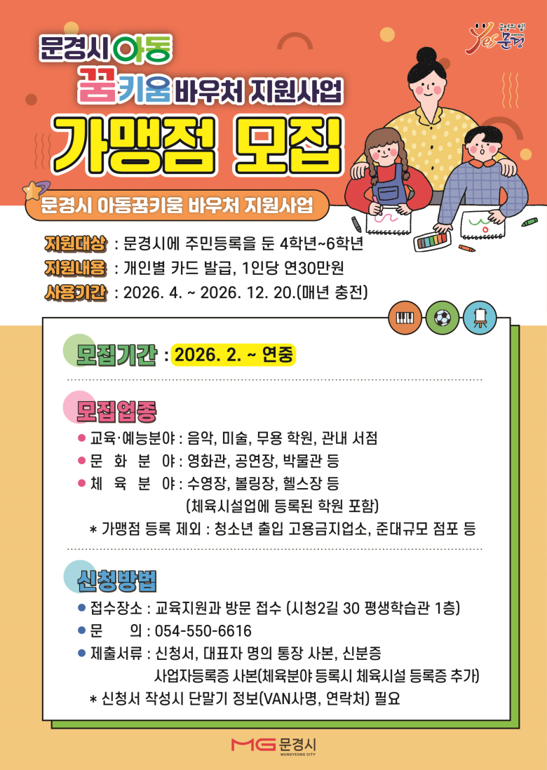 문경시는 지역 아동의 건강한 성장과 다양한 체험 기회 제공을 위해 추진 중인 ‘아동꿈키움 바우처 지원사업’과 관련해 가맹점을 모집한다고 밝혔다.‘문경시 아동꿈키움 바우처 지원사업’은 문경시에 주민등록을 둔 초등학교 4학년부터 6학년까지 아동을 대상으로 개인별 전용카드를 발급해 1인당 연간 30만 원을 지원하는 아동 맞춤형 바우처 사업이다. 바우처 사용 기간은 2026년 4월부터 12월 20일까지이며 매년 충전 방식으로 운영된다. 가맹점 모집은 2026년 2월부터 연중 상시 진행된다.모집 대상은 아동의 교육·문화·체육 활동과 연계된 업종이다. ▲교육·예능 분야(음악·미술·무용학원, 관내 서점) ▲문화 분야(영화관, 공연장, 박물관 등) ▲체육 분야(수영장, 볼링장, 헬스장 등 체육시설업에 등록된 학원 포함) 등이 해당된다. 다만 청소년 출입·고용금지업소와 준대규모 점포 등은 가맹점 등록 대상에서 제외된다.가맹점 신청은 문경시 교육지원과 방문 접수로 진행되며, 접수처는 문경시 시청2길 30 평생학습관 1층이다. 제출 서류는 ▲신청서 ▲대표자 명의 통장 사본 ▲신분증 ▲사업자등록증 사본이며, 체육 분야 가맹점은 체육시설 등록증을 추가로 제출해야 한다. 또한 신청서 작성 시 카드 단말기 정보(VAN사명 및 연락처)를 반드시 기재해야 한다.신은옥 교육지원과장은 “아동들이 다양한 분야에서 꿈을 키울 수 있도록 지역 내 우수한 가맹점들의 적극적인 참여를 기대한다”며 “이번 사업이 아동 복지 증진은 물론 지역 상권 활성화에도 도움이 될 것으로 기대한다”고 말했다.가맹점 모집과 관련한 자세한 사항은 문경시 교육지원과(054-550-6616)로 문의하면 된다.