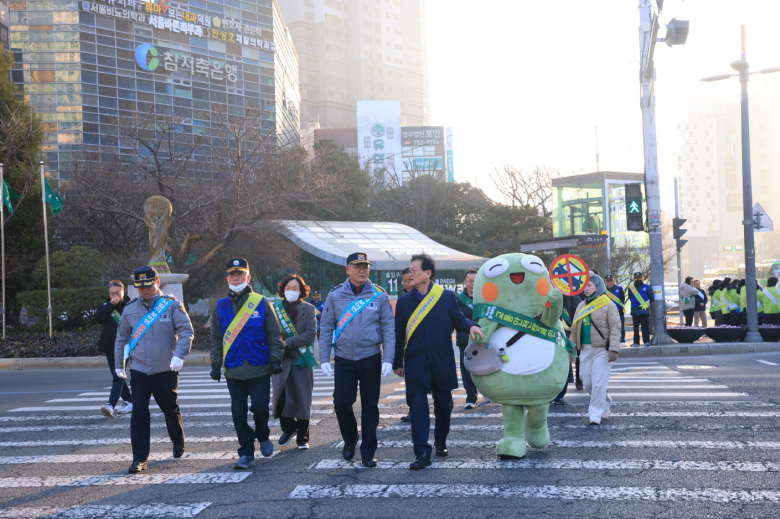 대구 수성구가 설 명절을 앞둔 12일 범어네거리 일대에서 수성경찰서와 함께 ‘2026 설맞이 교통안전 합동 캠페인’을 벌였다.이번 캠페인은 설 연휴 기간 교통량 증가에 대비해 교통사고 없는 안전한 명절 분위기를 조성하기 위해 마련됐다.현장에는 김대권 수성구청장과 최미섭 수성경찰서장을 비롯해 수성구 보행지킴이, 수성재향경우회, 녹색어머니회, 모범운전자회, 해병대전우회 등 5개 교통 관련 봉사단체 회원 70여 명이 참여해 출근길 시민들을 대상으로 안전 운전을 당부했다.참여자들은 전 좌석 안전띠 착용, 음주운전 금지, 과속 금지 등 귀성길 안전 수칙을 집중 홍보했다. 특히 최근 강화된 교차로 우회전 시 일시정지 및 보행자 보호 의무를 안내하며 선진 교통문화 정착을 강조했다.수성구 대표 캐릭터 ‘뚜비’도 현장에 나와 교통안전 메시지를 친근하게 전달하며 시민들의 관심을 모았다.김대권 수성구청장은 “추운 날씨에도 구민 안전을 위해 힘써준 봉사단체와 경찰 관계자들께 감사드린다”며 “구민 모두가 안전하고 행복한 설 연휴를 보낼 수 있도록 교통 대책 추진에 만전을 기하겠다”고 말했다.한편 수성구는 설 연휴 기간 특별교통대책 상황실을 운영하고 실시간 교통 상황 관리와 불법 주정차 계도 활동을 통해 주민 불편을 최소화할 계획이다.