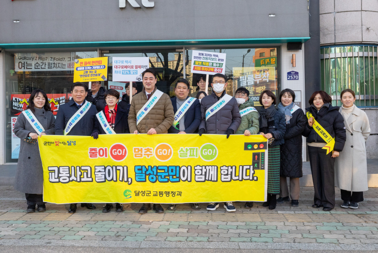 대구 달성군이 설 명절을 앞둔 12일 화원삼거리 일원에서 교통사고 예방과 안전한 교통문화 확산을 위한 ‘설맞이 교통안전 캠페인’을 벌였다.이날 캠페인에는 최재훈 달성군수와 김은영 달성군의회 의장을 비롯해 달성경찰서, 개인택시달성군지소, 새마을교통봉사대, 녹색어머니회 등 유관기관 관계자 60여 명이 참여했다. 참가자들은 현수막과 홍보 피켓을 활용해 운전자와 주민들에게 교통안전 수칙을 안내했다.특히 전 좌석 안전띠 착용의 중요성을 집중 홍보하고 연휴 기간 교통량 증가에 대비해 안전거리 확보와 보행자 보호, 교통법규 준수 등 기본적인 안전운전 실천을 당부했다. 명절 분위기 속 부주의로 인한 사고를 예방하자는 취지다.최재훈 달성군수는 “설 연휴는 이동량이 크게 늘어나는 시기인 만큼 교통안전에 대한 각별한 주의가 필요하다”며 “운전자와 보행자 모두가 배려와 양보의 마음으로 도로 위 안전문화 확산에 동참해 주길 바란다”고 말했다.