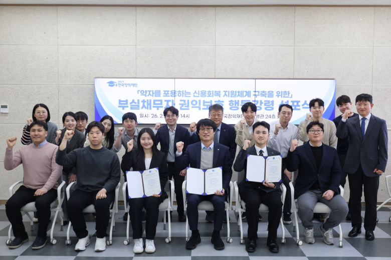 한국장학재단이 지난 12일 대구 별관에서 학자금대출 부실채무자의 권익을 보호하고 책임 있는 채권관리를 강화하기 위해 ‘학자금대출 부실채무자 권익보호 행동강령’을 제정하고 선포식을 개최했다.이번 행동강령은 ▲법률 준수 ▲공정한 절차 준수 ▲전문성 강화 ▲책임행정 등 네 가지 핵심 원칙을 중심으로 마련됐다. 재단은 채무자의 권익을 존중하는 채권관리 체계를 확립하고 신뢰받는 교육금융 서비스를 제공한다는 방침이다.이날 선포식에는 정홍주 학생금융본부장을 비롯한 부실채권 관리 담당 임직원이 참석해 행동강령 실천 의지를 다졌다.