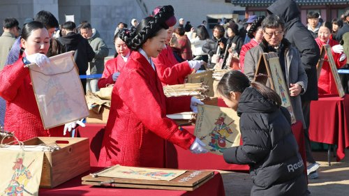 설을 하루 앞둔 16일 서울 경복궁 흥례문 광장에서 열린 '2026년 병오년 설맞이 세화 나눔' 행사에서 관람객들이 세화를 받고 있다. 연합