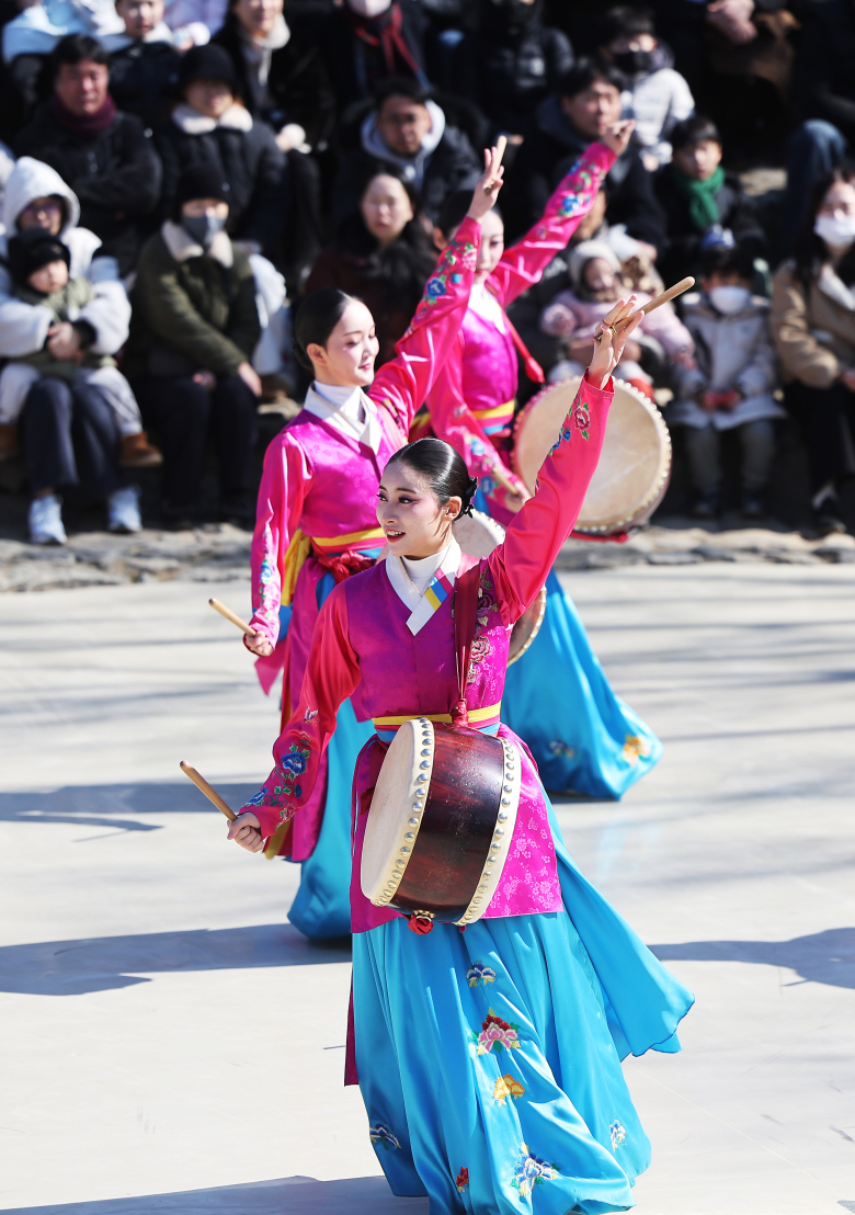 설 연휴 마지막 날인 18일 경기도 용인시 한국민속촌을 찾은 시민들이 삼도판굿 공연을 관람하고 있다. 연합