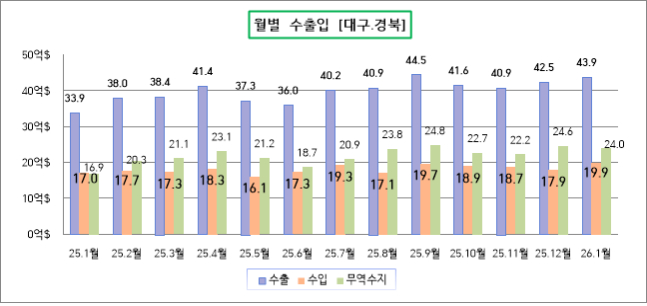 올해 1월 대구·경북지역 수출이 큰 폭으로 증가하며 무역수지 24억 달러 흑자를 기록했다.19일 대구본부세관이 발표한 ‘2026년 1월 대구·경북 수출입 동향’에 따르면 대구·경북 수출은 전년 동월 대비 29.4% 증가한 43억9000만 달러, 수입은 17.4% 늘어난 19억9000만 달러로 집계됐다. 이에 따라 무역수지는 42.0% 증가한 24억 달러 흑자를 나타냈다.